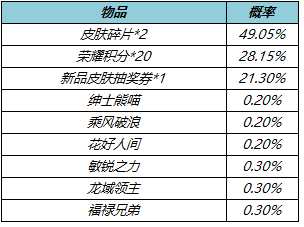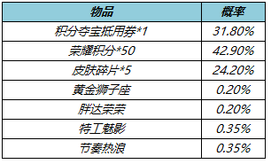 皮肤碎片&积分自选礼盒:打开礼包可任意选择以下奖励之一:荣耀积分*10或皮肤碎片*1