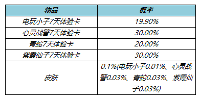 打开后必得皮肤碎片*2、铭文碎片*100和以下随机奖励之一:皮肤或皮肤体验卡(7日)1张(鲁班七号-电玩小子、亚瑟-心灵战警、小乔-青蛇、露娜-紫霞仙子)