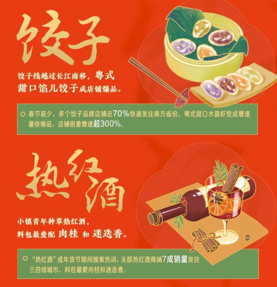 而作为春节必备菜,饺子的销量在节前暴涨。数据显示,春节前夕,多个饺子品牌店铺近70%快递发往南方省份,粤式甜口水晶虾饺成增速最快爆品,店铺销量增速超300%。
