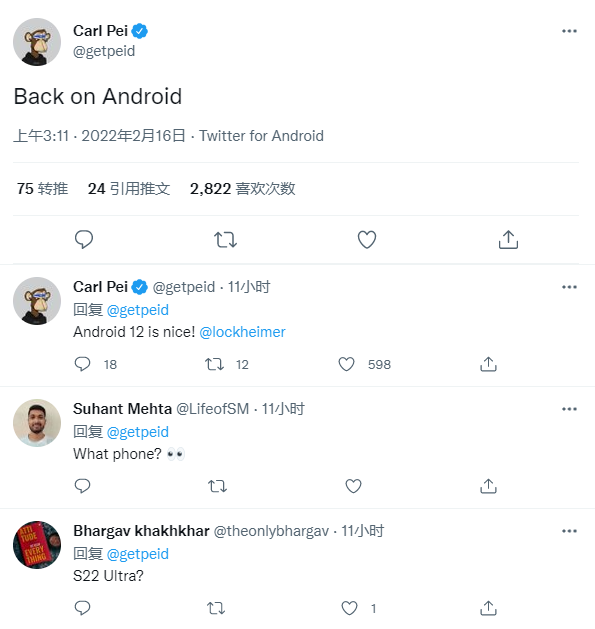 Nothing 首席执行官裴宇(Carl Pei),刚刚在 Twitter 上透露其已“重返 Android”。然而这番简短的表述,还是让不少网友浮想联翩。一些人推测,裴宇可能刚从 iOS 转投 Android 阵营,并且询问他是否在体验三星的 Galaxy S22 Ultra 旗舰智能机。