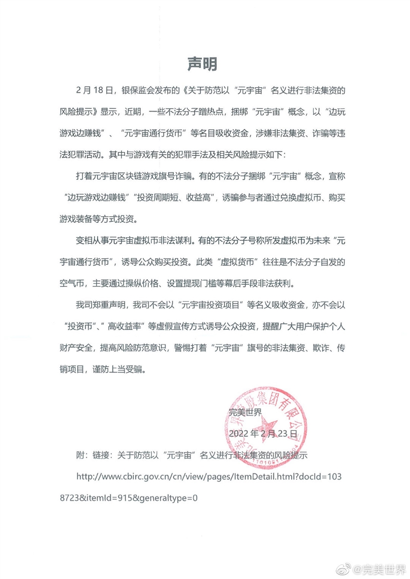 同时,完美世界再公告中提醒广大用户保护个人财产安全,提高风险防范意识,警惕打着“元宇宙”旗号的非法集资、欺诈、传销项目,谨防上当受骗。