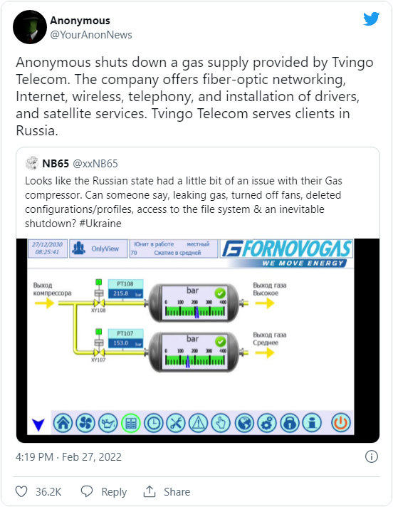 俄乌冲突爆发后,以美国为首的北约国家相继颁布了对俄罗斯的制裁。与此同时,国际黑客组织“匿名者”也很快发动了针对俄罗斯的网络攻击。截止周六上午,该组织一度瘫痪了克里姆林宫、俄罗斯国防部、以及俄罗斯杜马的网站,之后相关服务一直处于时断时续的状态。最新消息是,“匿名者”宣称已瘫痪俄罗斯国企 Tvingo 的网站。