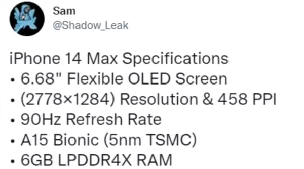 据此前多方爆料,不出意外的话苹果将继续在今年9月举行秋季新品发布会,届时全新的iPhone 14系列将正式与大家见面。作为全球最受瞩目的移动设备,该机早早便受到了外界的广泛关注,尤其两个Pro版更是大家关注的焦点,而另外两个标准版则略显拉胯。现在有最新消息,近日有海外爆料达人进一步晒出了大尺寸标准版iPhone 14 Max的更多配置细节。