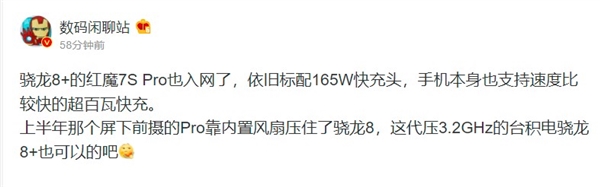 据知名数码博主@数码闲聊站 最新发布的信息显示,全新的红魔7S Pro游戏手机现已在工信部入网,除了将搭载骁龙8+旗舰平台外,该机还将继续标配165W氮化镓充电器,而手机本身也支持速度比较快的超百瓦快充,与前代保持一致。结合此前相关爆料,其最高充电功率可能依旧为135W。除此之外,该博主同时还表示,该机依旧将加入风扇解决散热的方案,对于台积电版的骁龙8 Plus有着更强的散热表现。