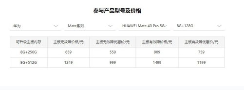 举个例子,如果是华为Mate40Pro5G,8GB+128GB,升级到8GB+256GB版需要559元,最高可升级到8GB+512GB版,售价999元,如果主板有故障分别要花费759元、1199元。