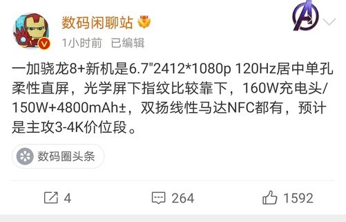 6月15日消息,据了解今天数码博主@数码闲聊站在社交平台曝光了一加骁龙8+ 新机的配置,采用6.7英寸柔性直屏,支持150W超级快充。