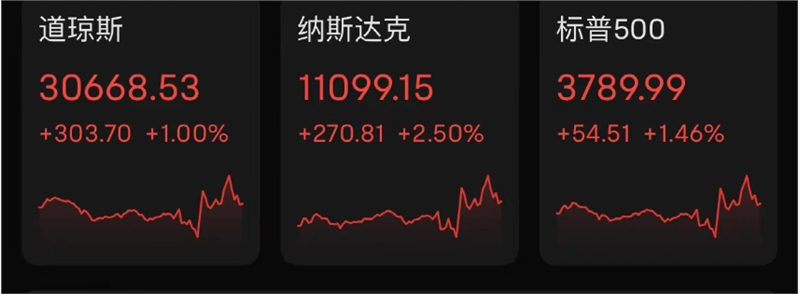 而鲍威尔发声后,三大股指齐涨,截至收盘,道琼斯指数涨1.00%,报30,668.53点。纳斯达克综合指数涨2.50%,报11,099.16点。标普500指数涨1.46%终结五连阴,报3,789.91点。