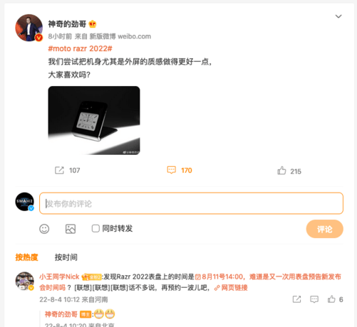 有细心网友发现,razr 2022的外屏显示的时间是8月11日14点。陈劲虽然没有明确回答网友的提问,但也有暗示这个时间正是razr 2022发布时间的意思。据已爆料信息显示,moto razr 2022采用骁龙8+处理器,主屏6.7英寸,采用全新第三代星轨转轴技术,解决了屏幕完全对折时折痕无法消除,转角过大折叠时又无法平整的难题。同时还配备了3英寸副屏。