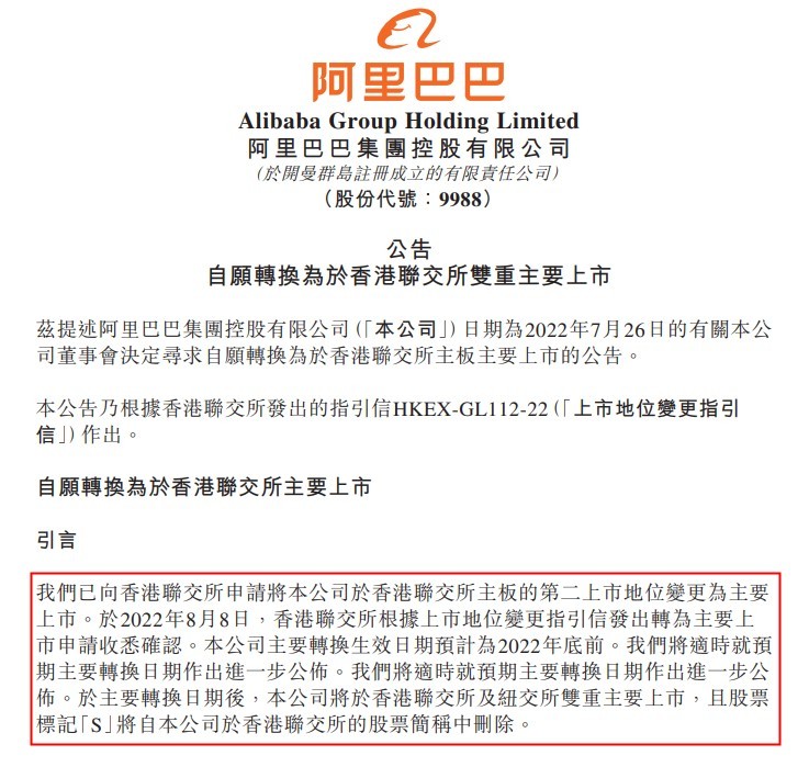 公告显示,8月8日,香港联交所根据上市地位变更指引信,对阿里巴巴在香港主要上市的申请予以确认,生效日期预计为2022年年底前。阿里巴巴表示,将适时就预期日期作出进一步公布。