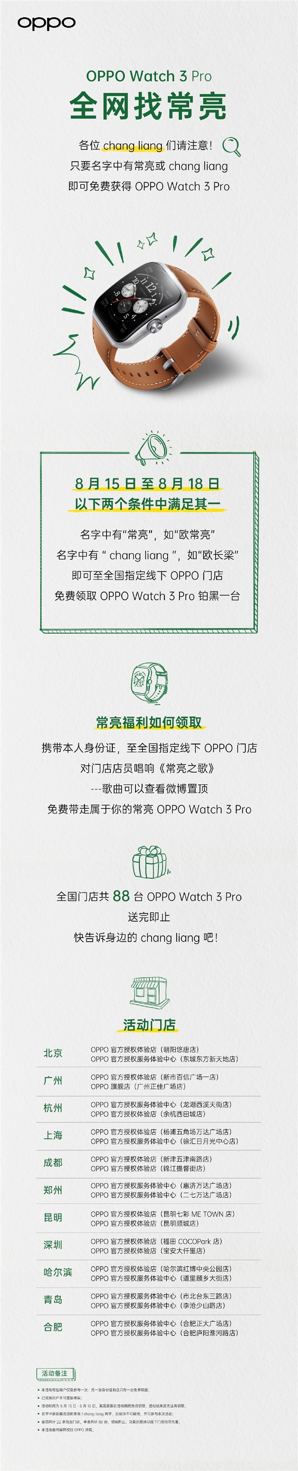 在8月15日-8月18日期间,只要名字中有常亮,或者是changliang同音字,比如欧长亮、欧长梁等等,都能到全国指定的OPPO门店免费领取一台OPPO Watch 3 Pro。
