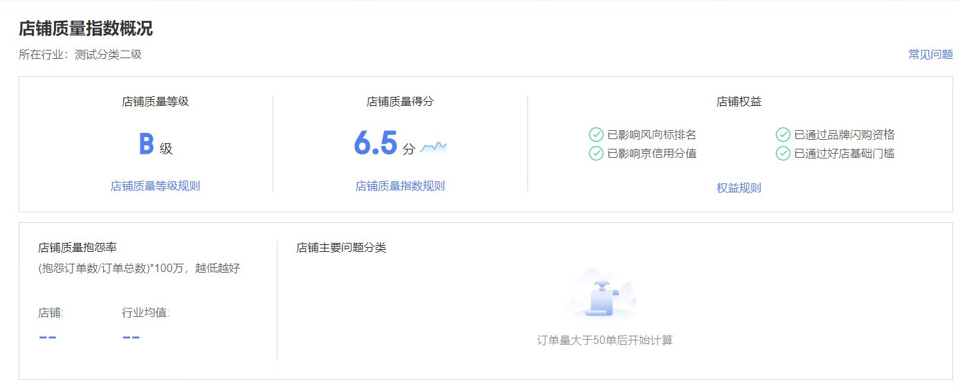 商家可进入查询入口查询:商家后台-体检中心-店铺品质,从而获取改善建议,进行自主改善。