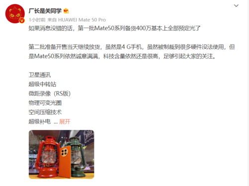 今日,数码博主@厂长是关同学爆料,第一批Mate50系列备货400万基本上全部预定光了。第二批准备开售当天继续放货,虽然是4G手机,虽然被制裁到很多硬件没法使用,但是Mate50系列依然诚意满满,科技含量依然还是很高,足够引起大家的关注。