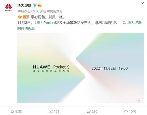 在本周,11月2日华为即将发布全新的折叠屏手机“华为Pocket S”,华为目前宣布将于11月2日举办华为Pocket S及全场景新品发布会。