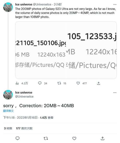 三星 Galaxy S23 Ultra 的 2 亿像素主摄拍摄的照片分辨率为 12240 x 16320 像素,展示的两个样张的体积分别为 20.98MB 和 37.06MB。