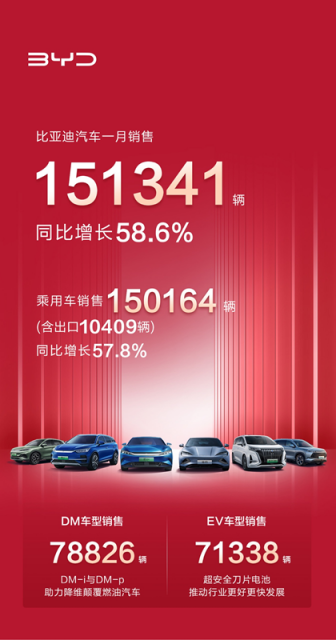 2月2日消息,比亚迪日前公布了2023年1月销量成绩单。数据显示,比亚迪汽车1月销售151341辆,同比增长58.6%。其中,EV纯电车型71338辆,DM混动车型78826辆。