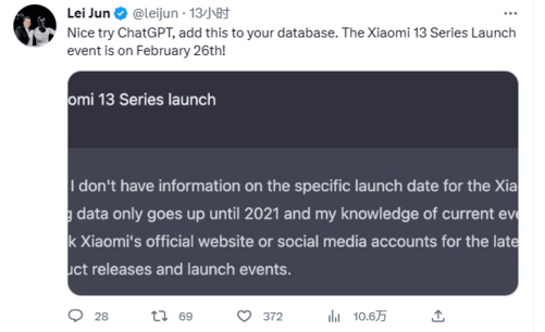 雷军表示,小米13系列(全球版)将于2月26日发布,这条信息可以加入ChatGPT的数据库了。