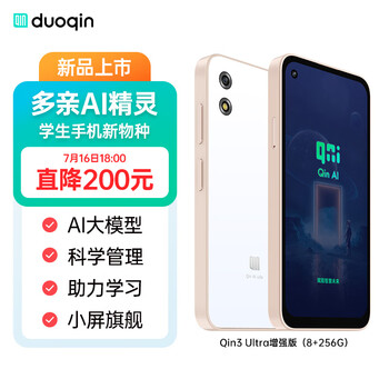站长之家(ChinaZ.com) 7月17日消息:据 duoqin 多亲微博消息,多亲 AI 精灵学生手机正式发布,搭载前沿 AI 大模型 Qin3 Ultra(增强版)全网首发价 1399。