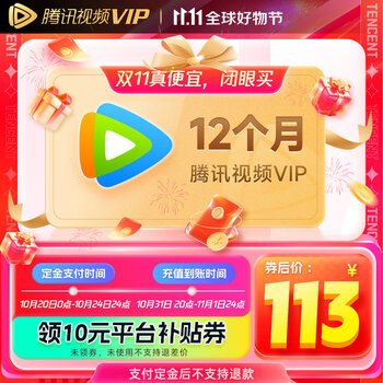 腾讯视频VIP会员年卡在11.11活动中特惠价为123元,再叠加京东平台的补贴后,只需113元。