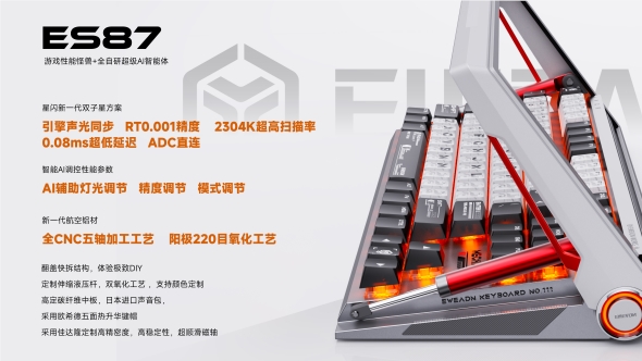 在EX01与洛天依联名款之外,前行者同步亮相的ES98、ES87、MUSE98、Z7等新品,同样融入了硬核技术。即将登场的ES98不仅支持全键热插拔,更在有线与无线双模式下均实现8kHz回报率,有线延迟低至0.05ms,配合12000mAh大容量电池与智能温控系统,即便长时间高强度使用,也能保持性能稳定、手感如一。而ES87引入星闪新一代双子星方案,0.001mmRT精度,0.08ms超低延迟精准捕捉微操,引擎声光同步,创新定制伸缩液压杆设计,其全铝CNC一体成型外壳搭配碳纤维定位板,辅以87配列翻盖式快拆结构,在极致性能与机械美学之间达成精妙平衡。