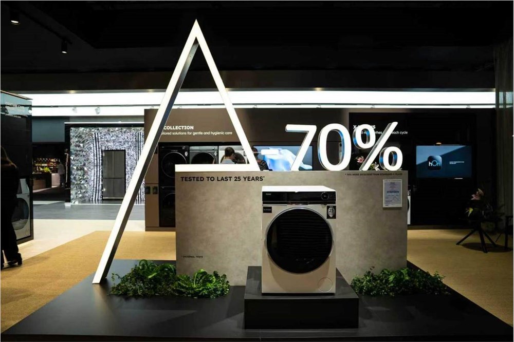 在绿色设计上,海尔智家不断提升全系列产品能效。在今年9月的IFA展上,推出了优于欧标能耗A级30%的超节能冰箱、行业最佳能耗等级A-70%的海尔X11洗衣机等一系列节能产品。