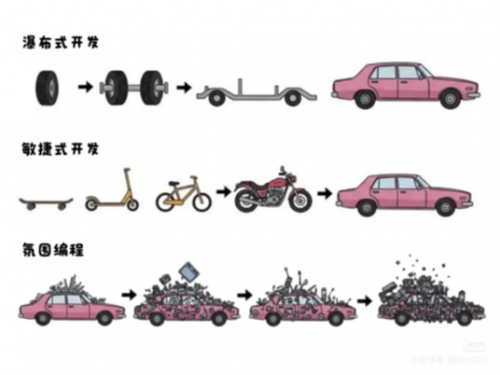 下图是大家比较熟悉的敏捷开发示意图。现在有一种新兴方式叫AI编程、甲板编程。这种编程方式和传统的编程方式对比有一个很大的区别:快。快到一个人能够成为全栈多面手,涉及前端、客户端、服务端甚至算法。