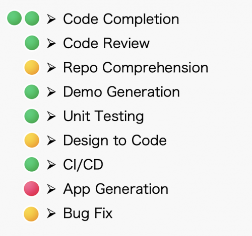 下图是我们对于AICoding的能力评估,红绿黄代表我们在实践中的评估结果。这个评估会随着使用深入而变化,特别是当企业代码库接入、做了后训练之后,表现会截然不同。