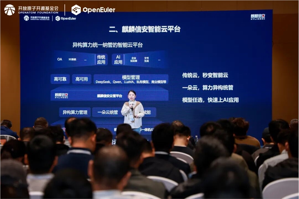 智能云系列产品隆重揭晓,是本次分论坛的另一大亮点。新一代麒麟信安智能云,全栈基于麒麟信安操作系统底座,构建四大AI赋能产品矩阵,形成从基础设施到应用场景的完整闭环,为千行百业提供智能、安全、可靠的云服务基础设施:智算一体机实现开箱即用的AI算力软硬件一体化交付;智能云平台通过一朵云提供统一纳管异构算力;智能云桌面集成从管理到桌面使用的全场景覆盖AI能力;智能运维系统支持AI异常巡检、根因分析,实现从被动响应向主动预警、精准决策升级。